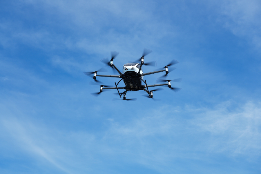 半径15米的小型停机坪上,一架无人驾驶载人航空器静待起飞。16组螺旋桨、碳纤维流线机身,宛若未来设备。指令下达,航空器轻盈升空,定格于50米高空,蓝天映衬着白色机身,科技感十足。