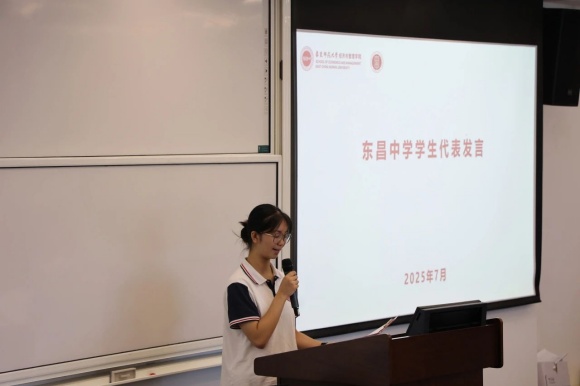 高一(2)班毛嘉洲同学作为学生代表发言,这位朝气蓬勃的女生以真挚的感恩之心开场,向华东师范大学经管学院和东昌中学的师长们深深致谢。