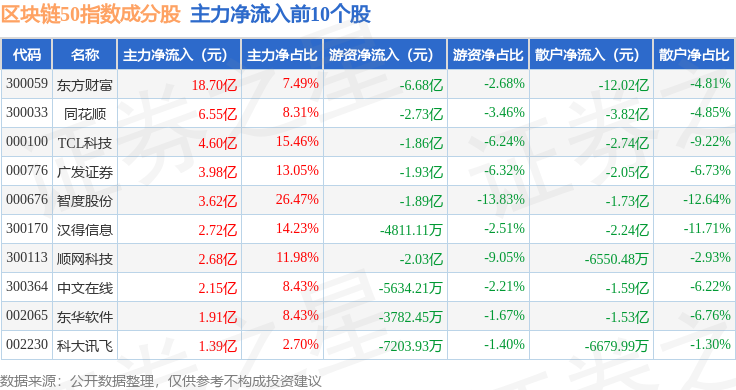 资金流向方面,区块链50(399286)指数成份股当日主力资金净流入合计39.88亿元,游资资金净流出合计21.95亿元,散户资金净流出合计17.93亿元。成份股资金流向详情见下表: