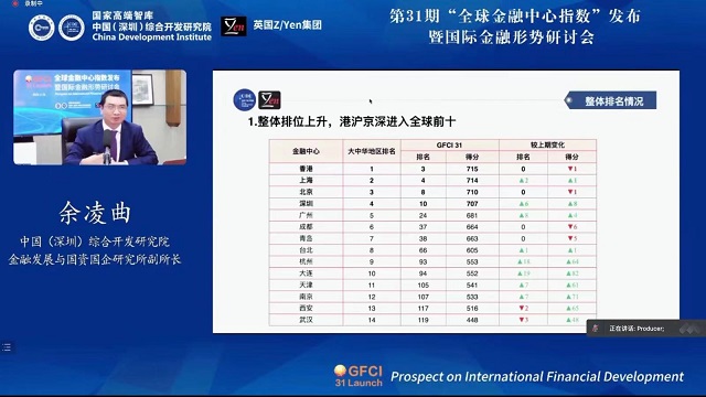 3月24日,由国家高端智库中国(深圳)综合开发研究院与英国智库Z/Yen集团共同编制的“第31期全球金融中心指数报告(GFCI 31)”在中国深圳和英国伦敦同时发布。